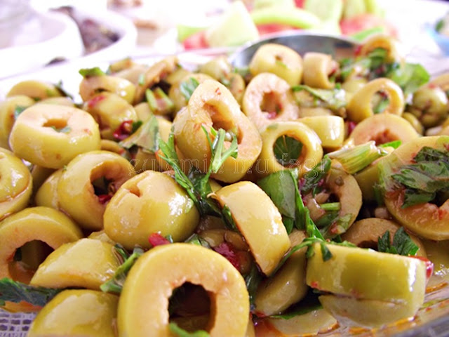 zeytin salatasını cok severim bizim yörede kırılmış zeytinın çekirdeginı cıkartarak yaparlar cok degişik bir lezzet olur sevgiler...